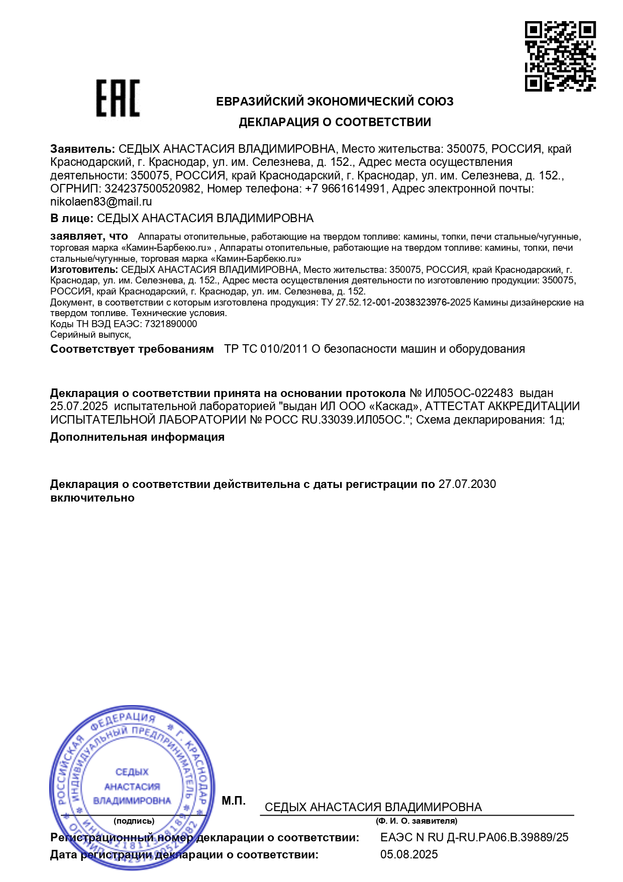 Декларация о соответствии зарегистрирована в ЕАЭС и действует до 27.07.2030.